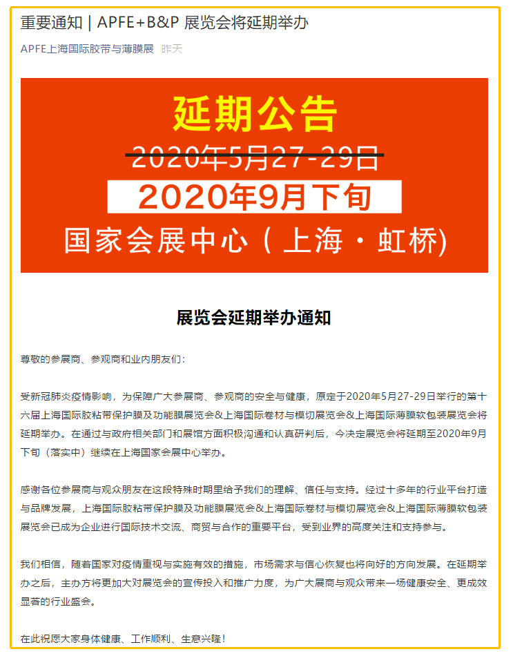 根據(jù)上海展臺設計搭建公司領藝展覽了解到,原定于2020年5月27-29日舉行的第十六屆上海國際膠粘帶保護膜及功能膜展覽會&上海國際卷材與模切展覽會&上海國際薄膜軟包裝展覽會將延期舉辦。在通過與政府相關部門和展館方面積極溝通和認真研判后,今決定展覽會將延期至2020年9月下旬(落實中)繼續(xù)在上海國家會展中心舉辦。如需上海展會設計請聯(lián)系領藝展覽,希望我們能在上海搭建上為您添磚加瓦,祝各位朋友收獲多多,滿載而歸!