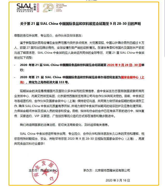 根據(jù)中食展設(shè)計搭建公司領(lǐng)藝展覽了解到,2020年SIAL China中國國際食品和飲料展覽會延期至9月28-30日舉行。如需中食展展會設(shè)計請聯(lián)系領(lǐng)藝展覽,希望我們能在中食展搭建上為您添磚加瓦,祝各位朋友收獲多多,滿載而歸!