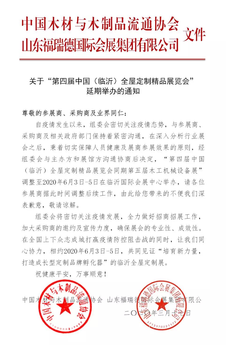 根據定制展設計搭建公司領藝展覽了解到,第四屆中國(臨沂)全屋定制精品展覽會”將延期舉辦。如需定制展展會設計請聯(lián)系領藝展覽,希望我們能在定制展搭建上為您添磚加瓦,祝各位朋友收獲多多,滿載而歸!