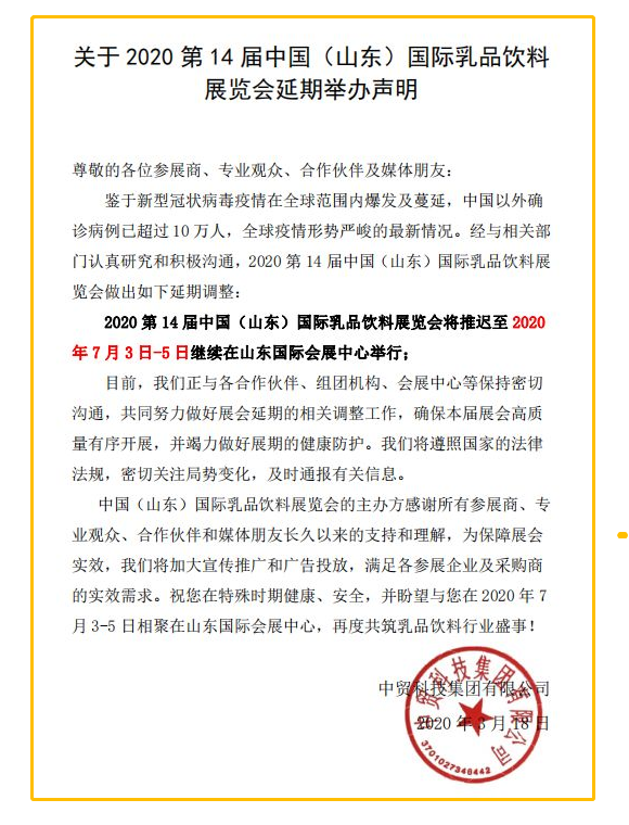 根據(jù)乳品飲料展設計搭建公司領(lǐng)藝展覽了解到,2020第14屆中國(山東)國際乳品飲料展覽會將推遲至2020年7月3日-5日繼續(xù)在山東國際會展中心舉行。如需乳品飲料展設計請聯(lián)系領(lǐng)藝展覽,希望我們能在乳品飲料展搭建上為您添磚加瓦,祝各位朋友收獲多多,滿載而歸!