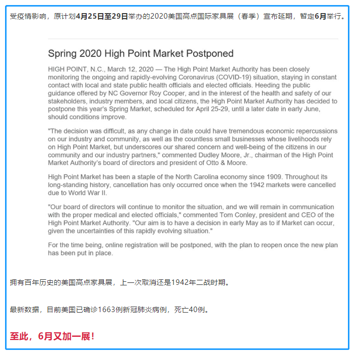 根據(jù)家具展設(shè)計(jì)搭建公司領(lǐng)藝展覽了解到,受疫情影響,原計(jì)劃4月25日至29日舉辦的2020美國高點(diǎn)國際家具展(春季)宣布延期,暫定6月舉行。如需家具展設(shè)計(jì)請(qǐng)聯(lián)系領(lǐng)藝展覽,希望我們能在家具展搭建上為您添磚加瓦,祝各位朋友收獲多多,滿載而歸!
