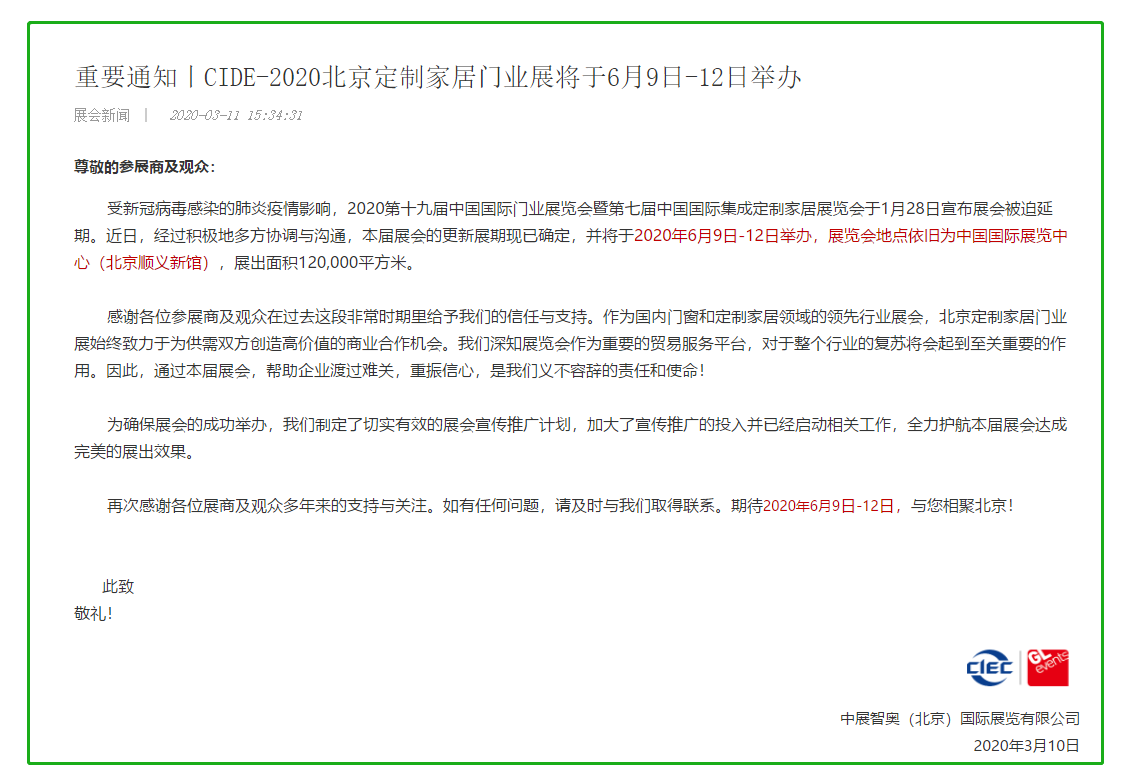 根據(jù)北京展會設(shè)計搭建公司領(lǐng)藝展覽了解到,受新冠病毒感染的肺炎疫情影響,2020第十九屆中國國際門業(yè)展覽會暨第七屆中國國際集成定制家居展覽會于1月28日宣布展會被迫延期。近日,經(jīng)過積極地多方協(xié)調(diào)與溝通,本屆展會的更新展期現(xiàn)已確定,并將于2020年6月9日-12日舉辦,展覽會地點依舊為中國國際展覽中心(北京順義新館),展出面積120,000平方米。如需北京展會設(shè)計請聯(lián)系領(lǐng)藝展覽,希望我們能在北京展會搭建上為您添磚加瓦,祝各位朋友收獲多多,滿載而歸!