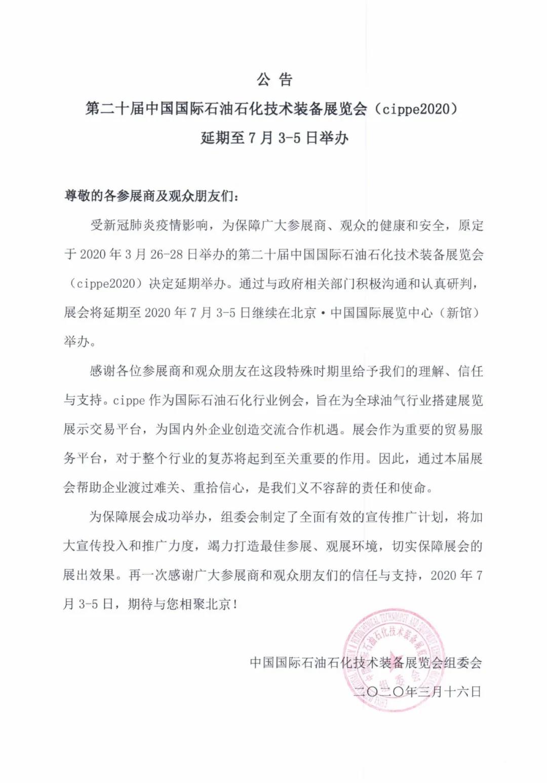根據(jù)北京石油展設(shè)計(jì)搭建公司領(lǐng)藝展覽了解到原定于2020年3月26-28日舉辦的第二十屆中國(guó)國(guó)際石油石化技術(shù)裝備展覽會(huì)(cippe2020),將延期至7月3日至5日在北京·中國(guó)國(guó)際展覽中心(新館)舉行,歡迎您屆時(shí)參展參觀。如需北京石油展展會(huì)設(shè)計(jì)請(qǐng)聯(lián)系領(lǐng)藝展覽,希望我們能在北京石油展搭建上為您添磚加瓦,祝各位朋友收獲多多,滿載而歸!